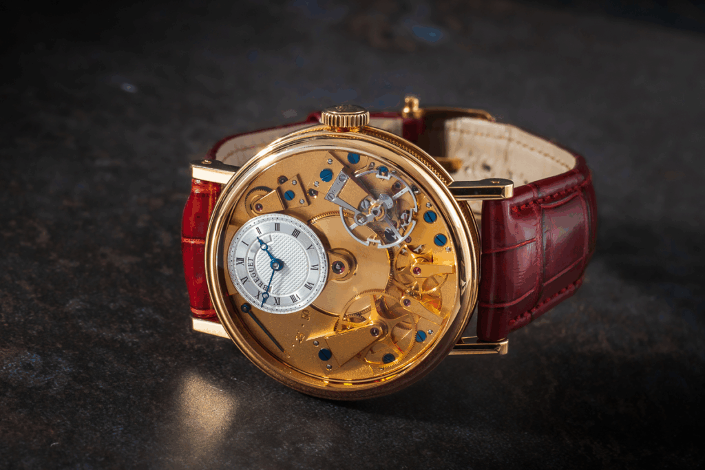 Kolekcja Tradition jest inspirowana zegarkami kieszonkowymi, które tworzył założyciel marki Abraham-Louis Breguet. Główną ideą przyświecającą zegarkom Tradition jest możliwość oglądania mechanizmu zegarka w takim sam sposób, jak ogląda składający go zegarmistrz. Mówimy więc o zegarku, którego tarcza (a w zasadzie tarczka), zajmuje niewielki fragment powierzchni widocznej przez szafirowe szkło, gdyż pierwsze skrzypce gra przeniesiony na „przód” zegarka kaliber 507DR. Mechanizm jest wykończony z najwyższą starannością, uwagę przyciągają niebieskie śruby świetnie kontrastujące ze złotą kopertą i tarczą zegarka, a gdy jest w ruchu możemy oglądać jego bijące serce. Na godzinie 11. umieszczony jest dyskretny wskaźnik rezerwy chodu, która wynosi 50 godzin. „Tył” mechanizmu również został szczodrze udekrowany, z większością kamieni łozyskowych w mechanizmie.
