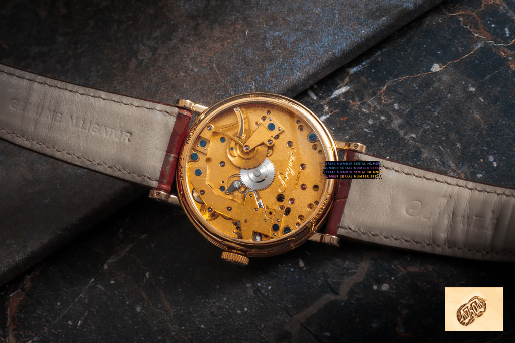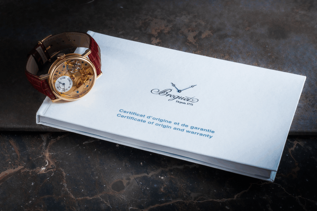 Na zegarku założony jest oryginalny pasek Breguet z aligatora oraz złote zapięcie. W komplecie z etui serwisowym Breguet oraz dokumentacją.