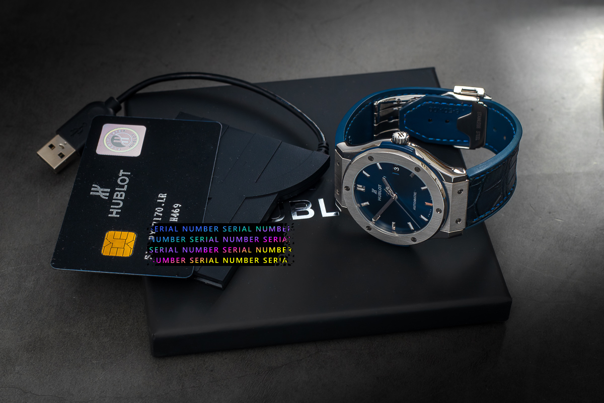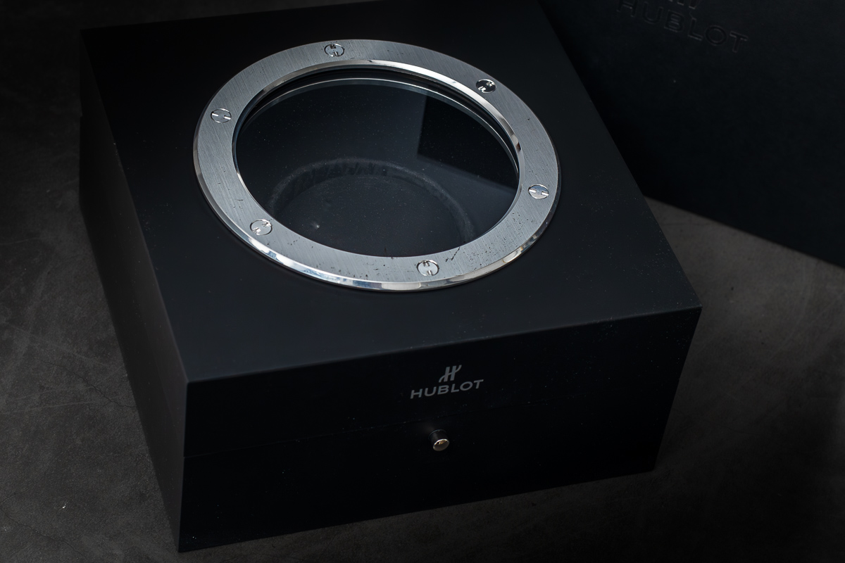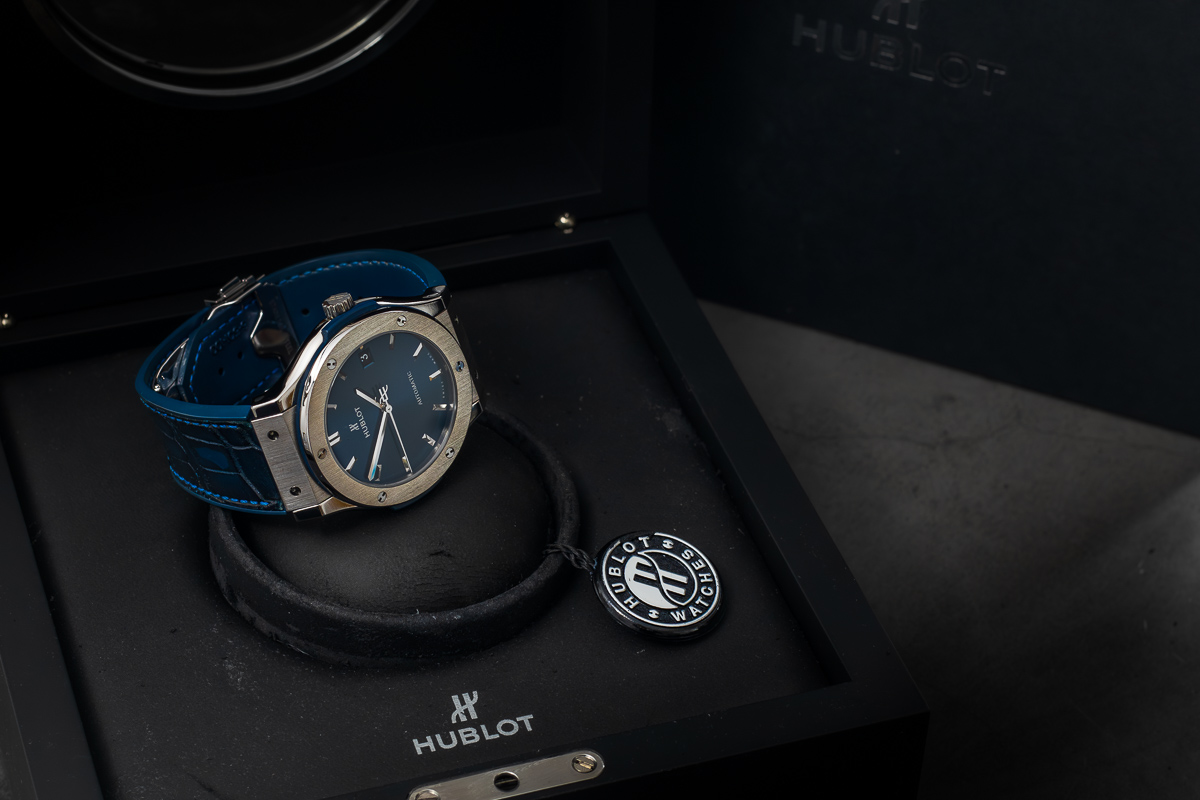The watch comes complete with its original HUBLOT box and papers, ‘no purchase date’ noted.
