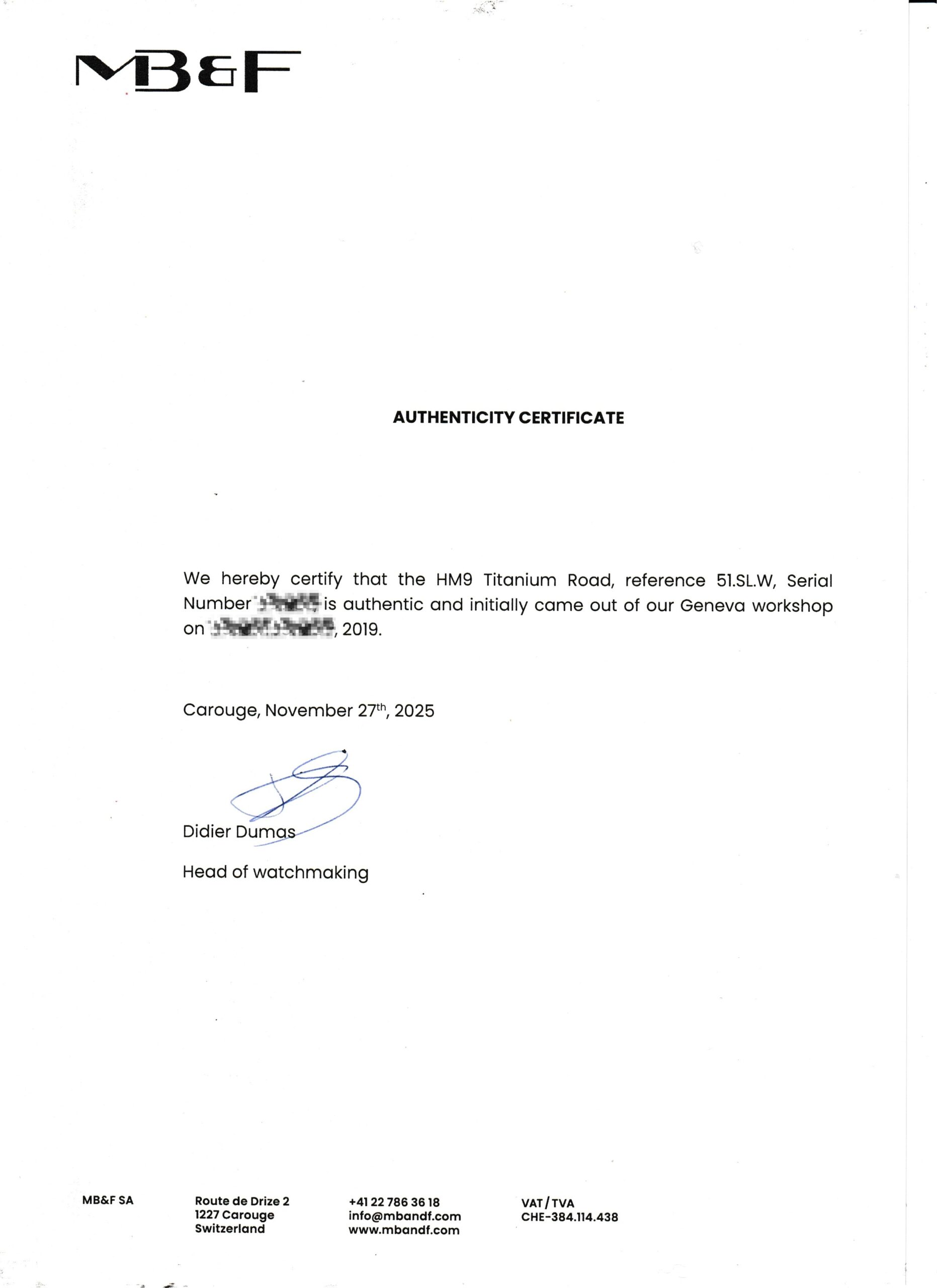 MB&F certificate of authenticity.