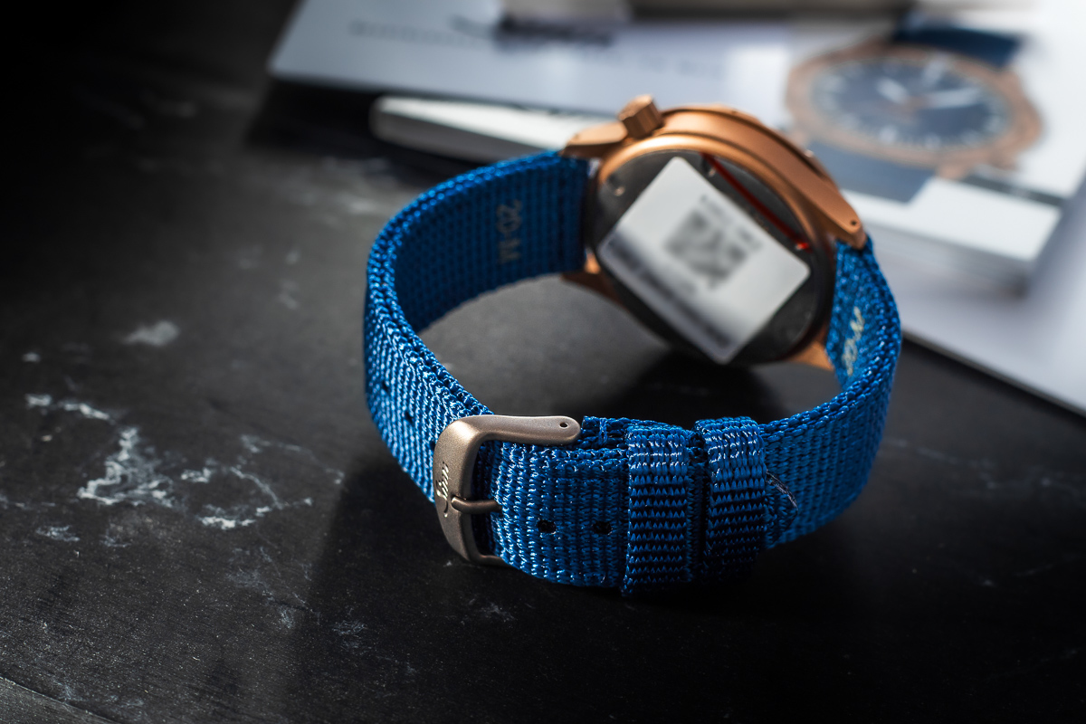 Goldbronze 125, our developed and patented material used for the case, crown, and bezel of this watch limited to 300 pieces, impresses with exceptional purity and radiates modern elegance and timeless aesthetics when combined with the dark blue dial. These features make the watch look stylish during leisure time, at work, and for special occasions.