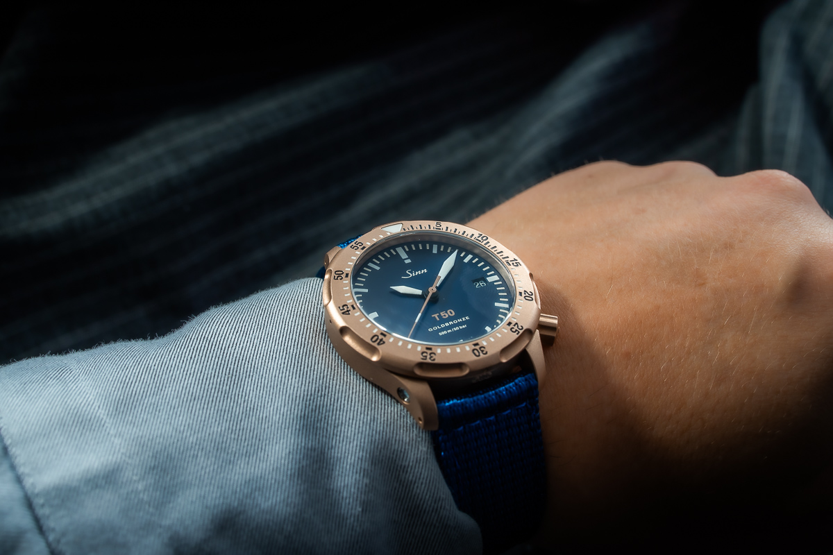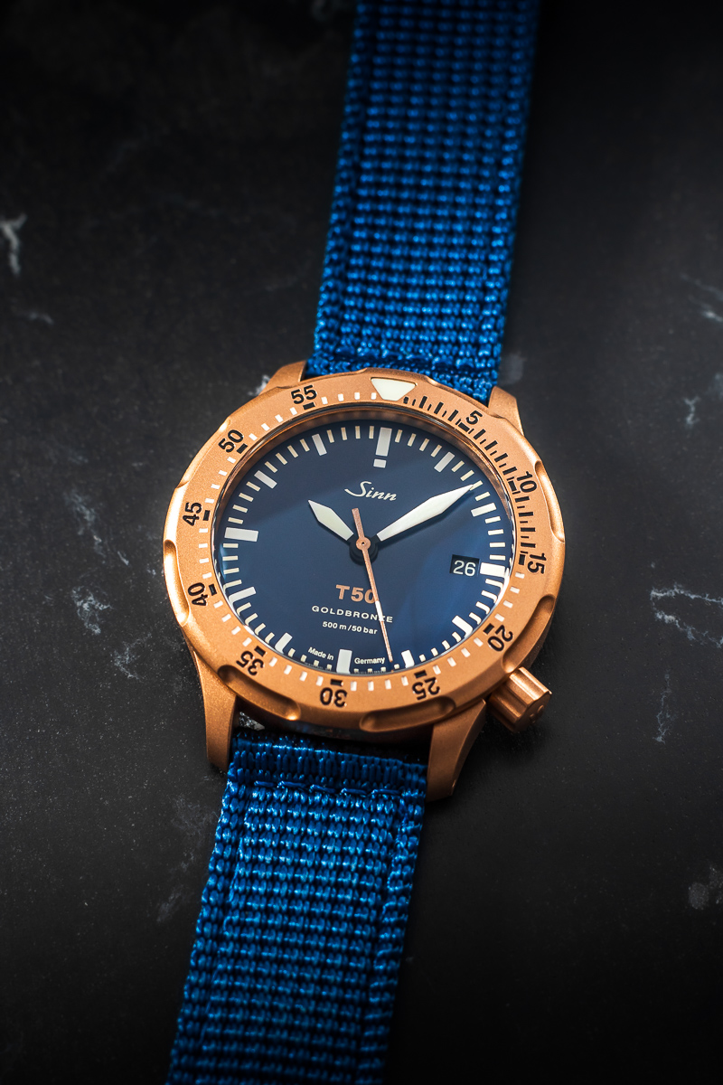 The T50 GOLDBRONZE B is a design that emphasizes technical finesse and prioritizes user safety. Goldbronze 125 perfectly complements the perfectly legible dark blue dial, giving the watch an elegant appearance. The deep blue shade evokes oceanic depths, and the silky, matte finish provides a sophisticated contrast to the case, crown, and bezel made of Goldbronze 125.