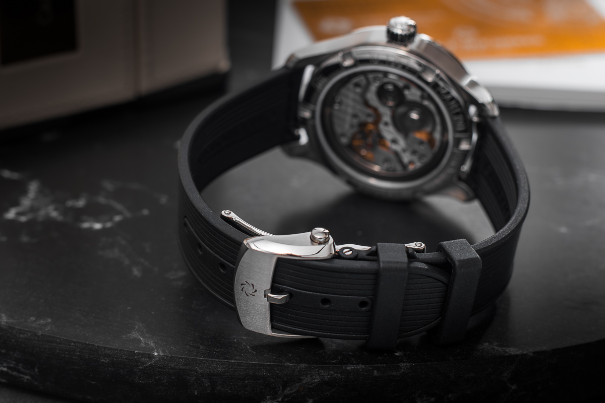 oryginalny Carl F. Bucherer. Wykonany z kauczuku. Sygnowany. Zapinany oryginalnym zapięciem motylkowym Carl F. Bucherer.