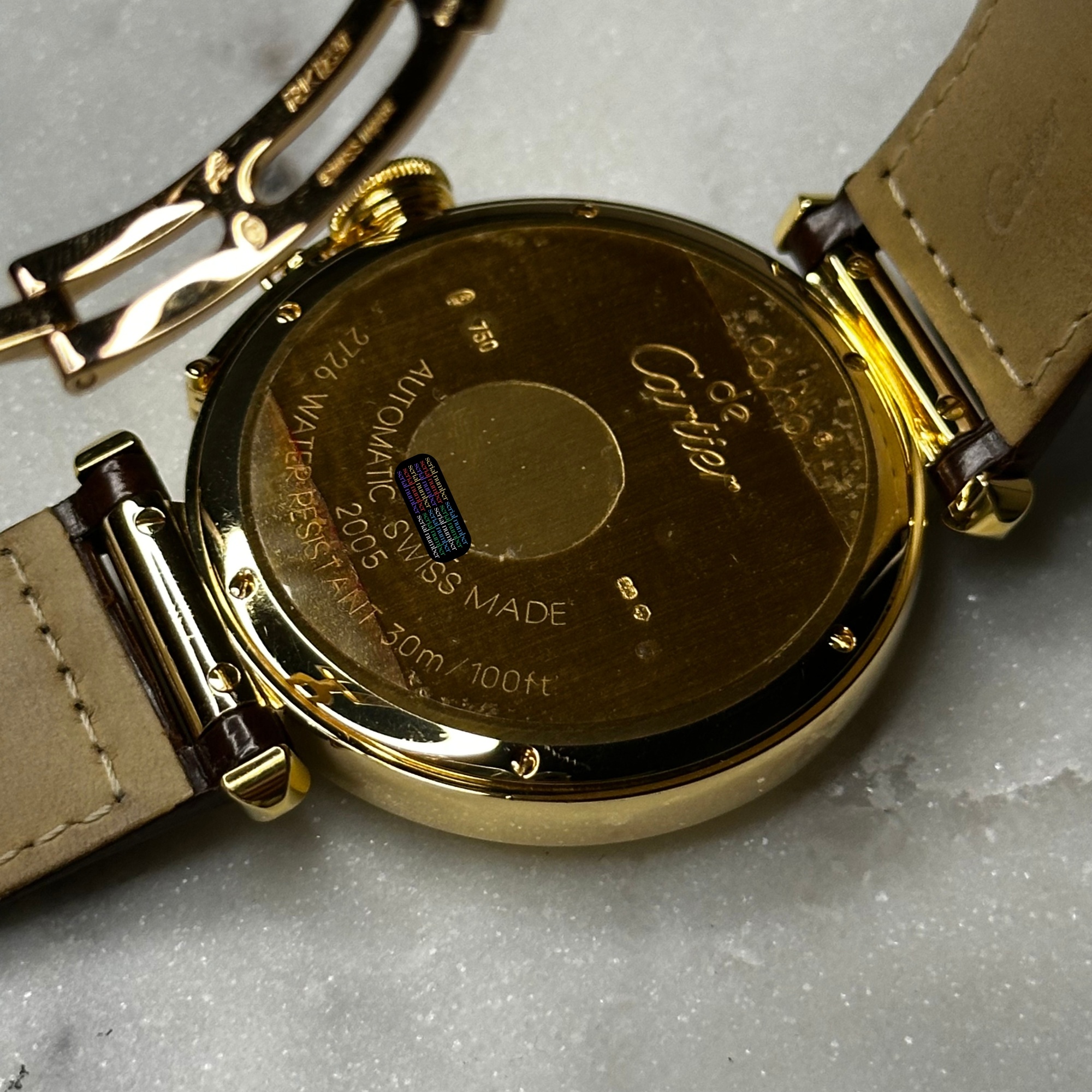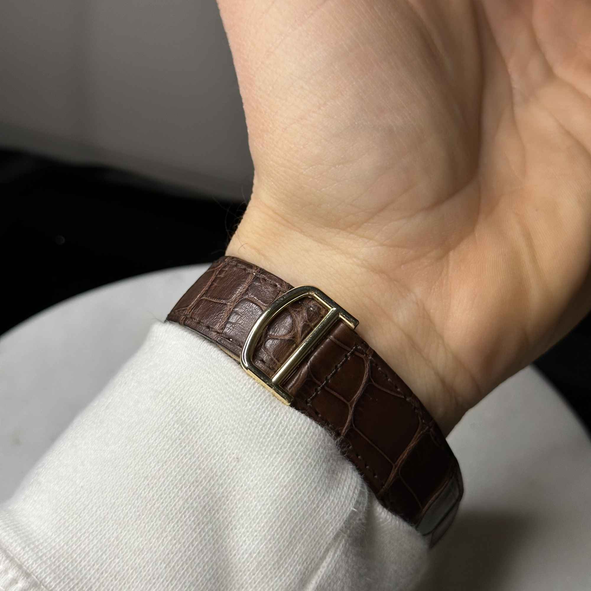 oryginalny Cartier. Wykonany z naturalnej skóry. Zapinany oryginalnym, złotym zapięciem na jeden zatrzask Cartier.
