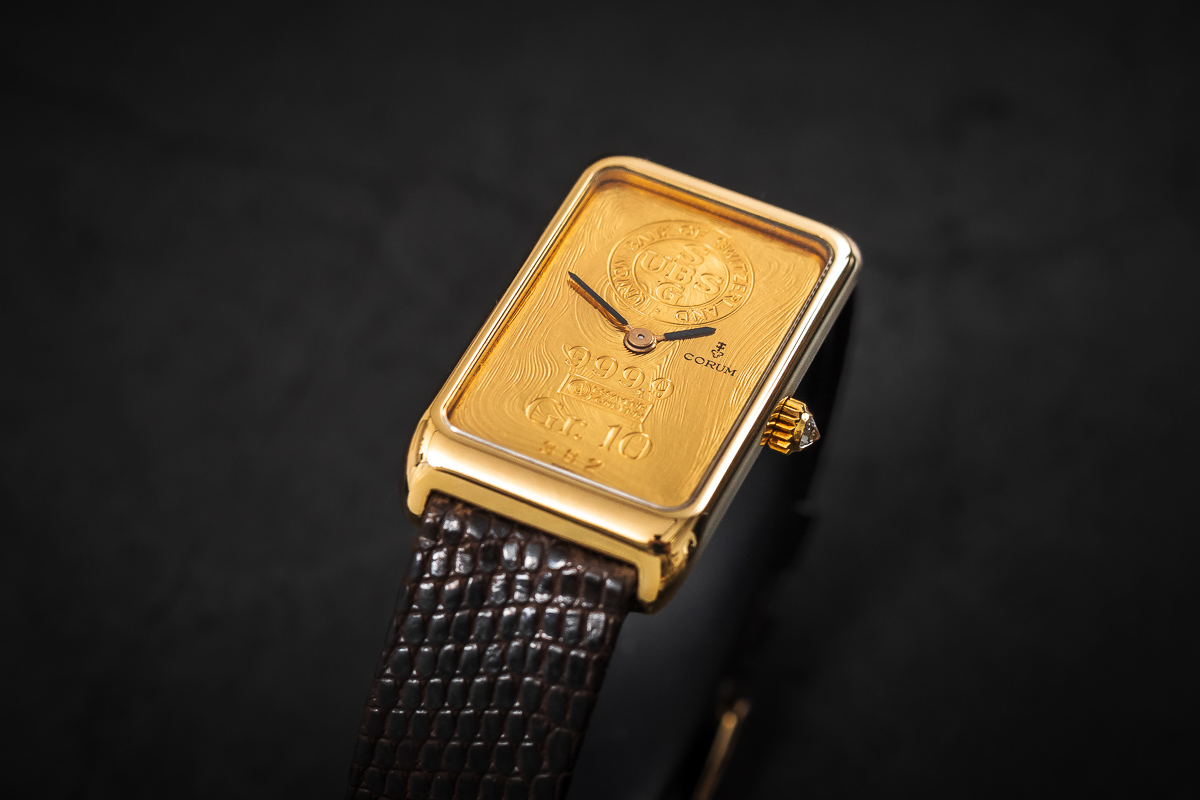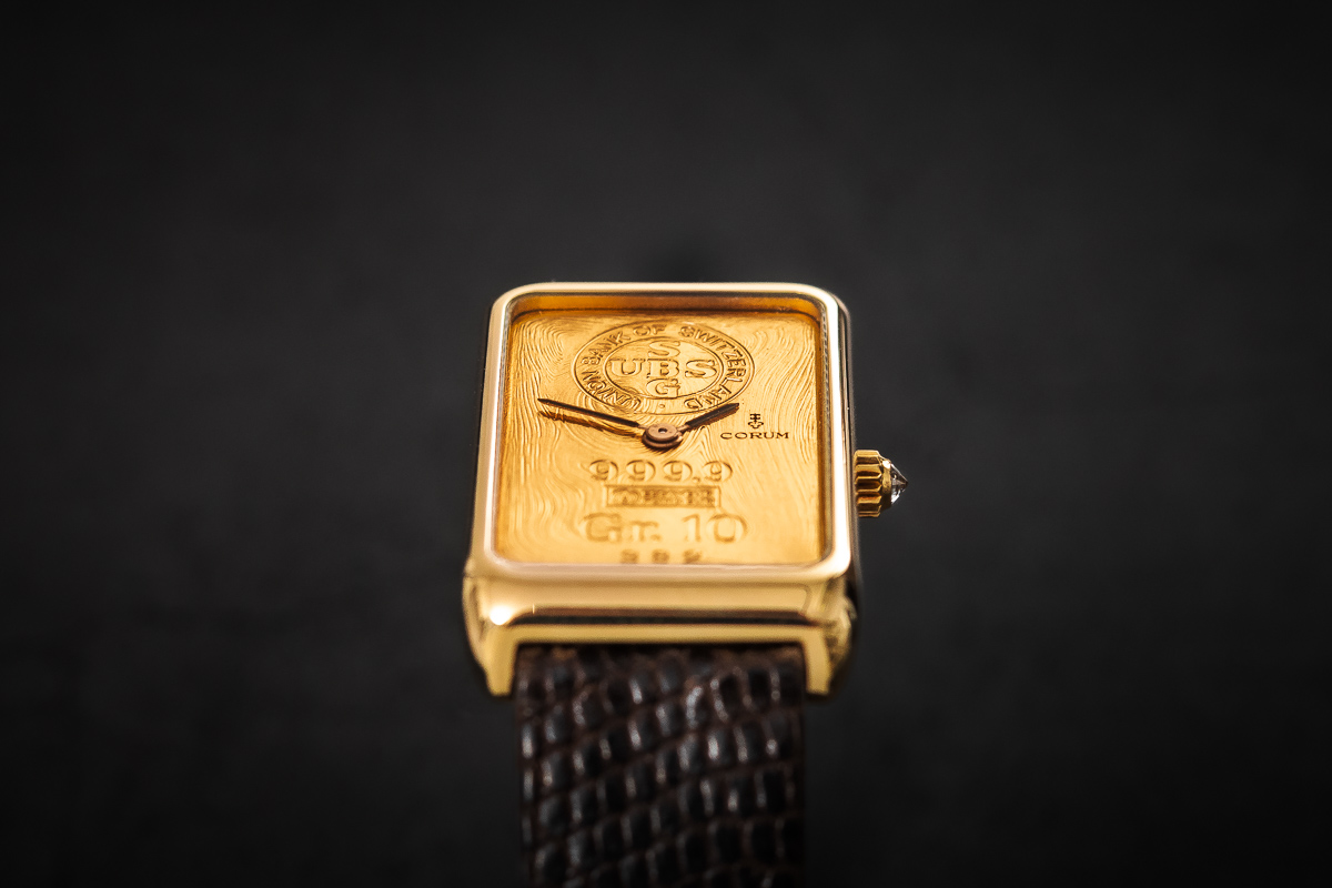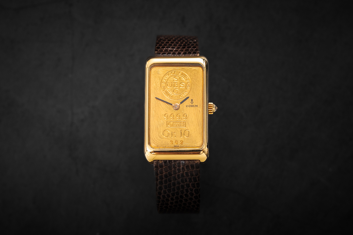 wykonana z 10 gramowej 24 karatowej sztabki złota. Sygnowana nazwą marki 'Corum’ ze wskazówkami.