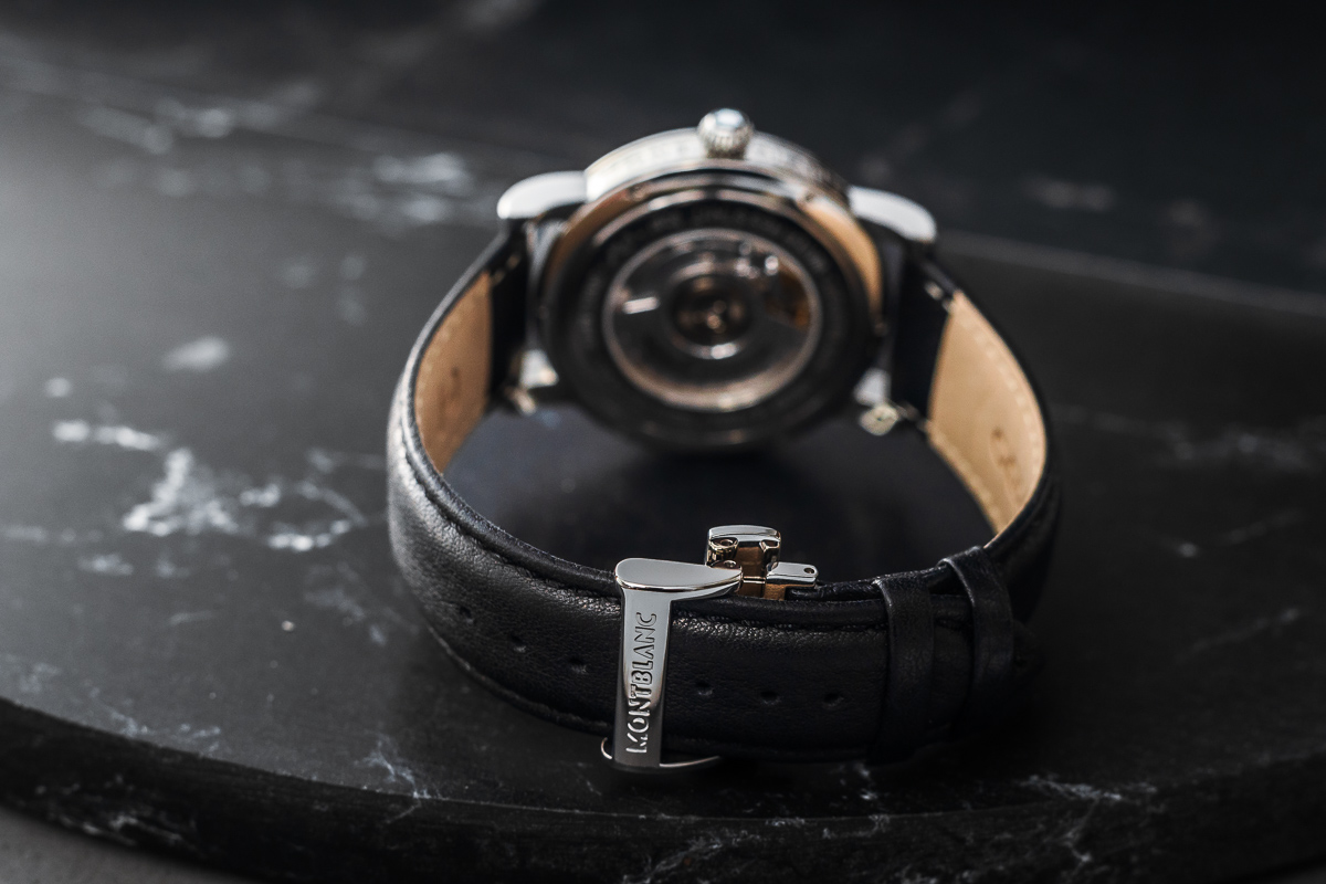 nieoryginalny. Wykonany z naturalnej skóry. Zapinana oryginalnym, stalowym zapięciem motylkowym Montblanc.