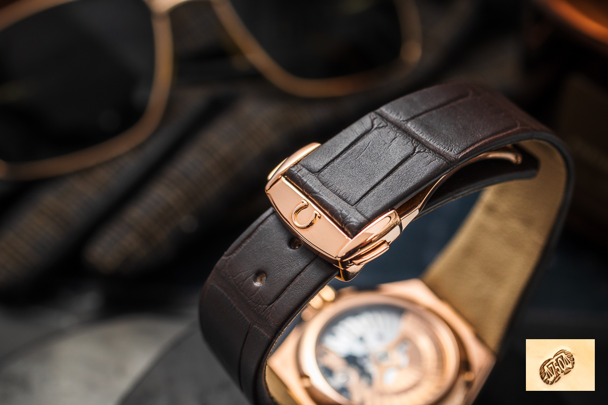 oryginalny Omega. Wykonany z naturalnej skóry. Zapinany oryginalnym, złotym 18K zapięciem na jeden zatrzask Omega.
