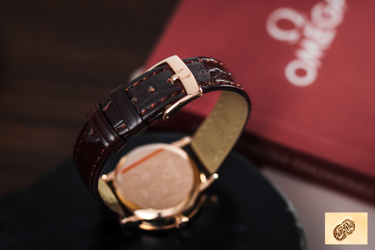oryginalny Omega. Wykonany z naturalnej skóry. Zapinany oryginalnym, złotym zapięciem klamerkowym Omega.