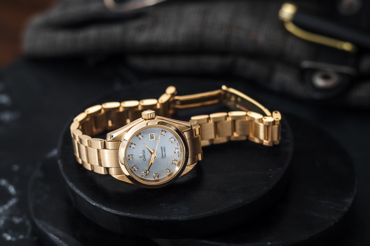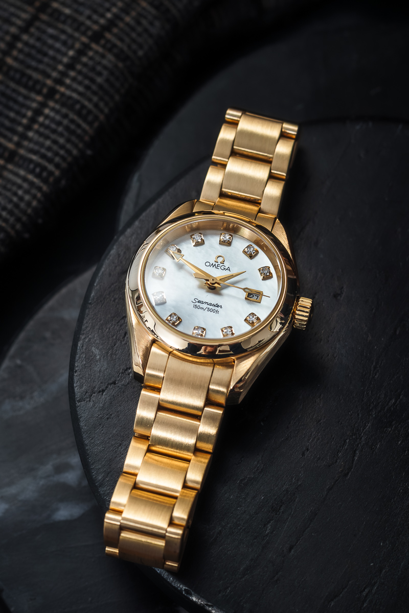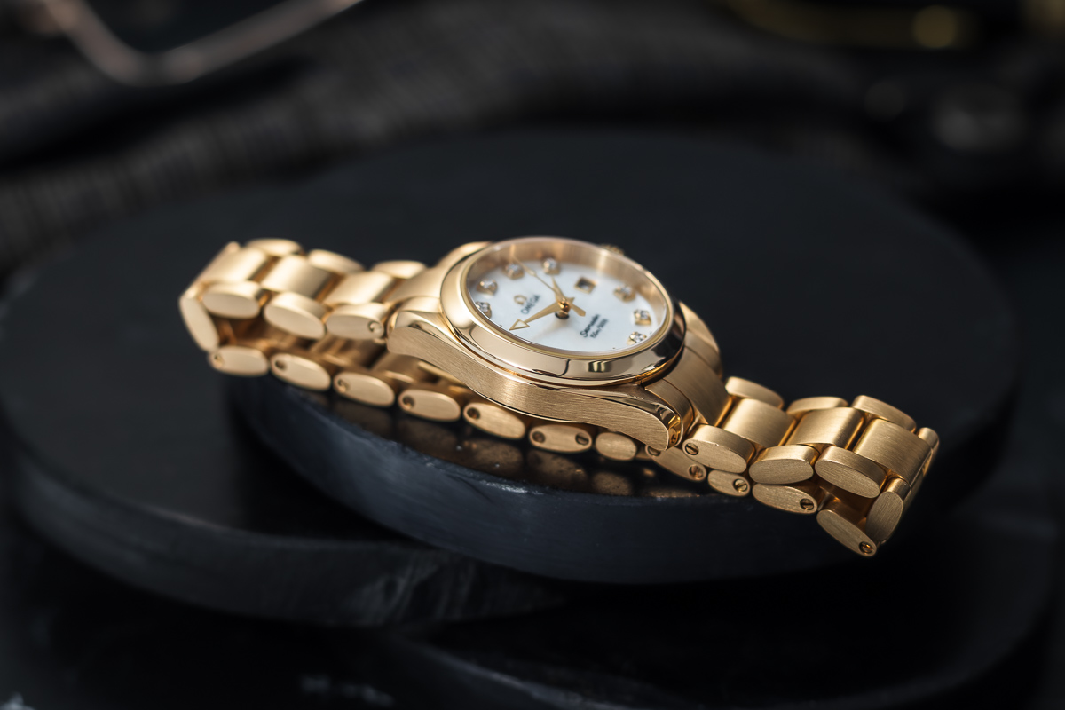 z jasnej masy perłowej. Sygnowana nazwą marki i modelu 'Omega’ z diamentami na indeksach i wskazówkami oraz datownikiem.