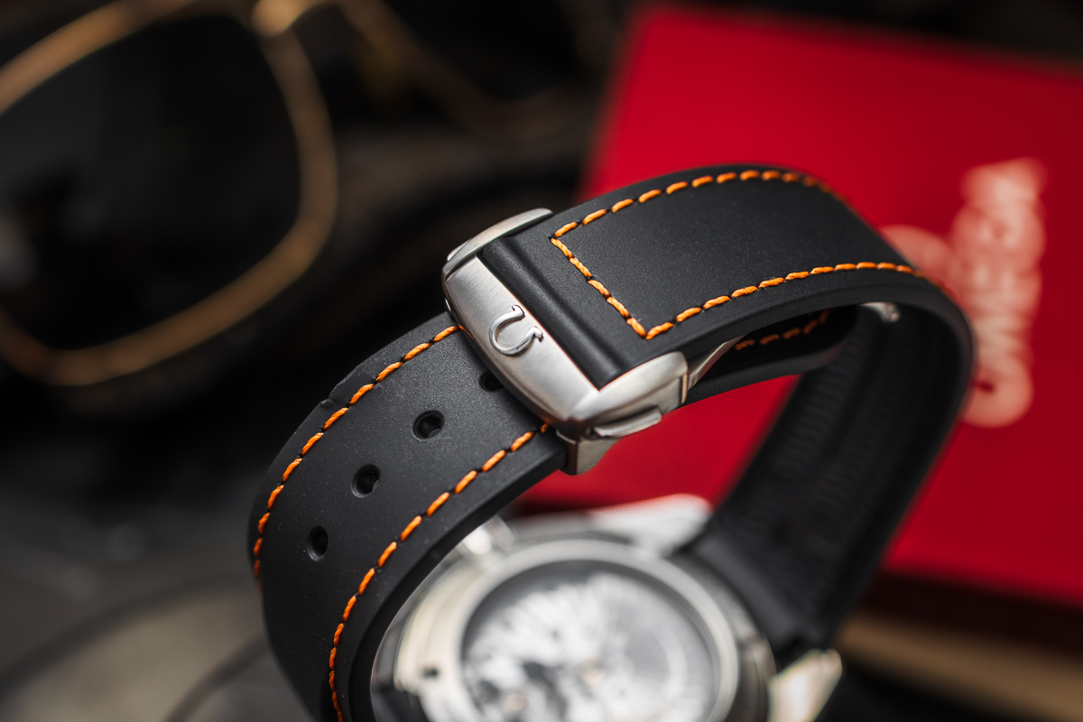 oryginalny Omega. Wykonany z czarnego kauczuku. Sygnowany. Zapinany oryginalnym, stalowym zapięciem na jeden zatrzask Omega.
