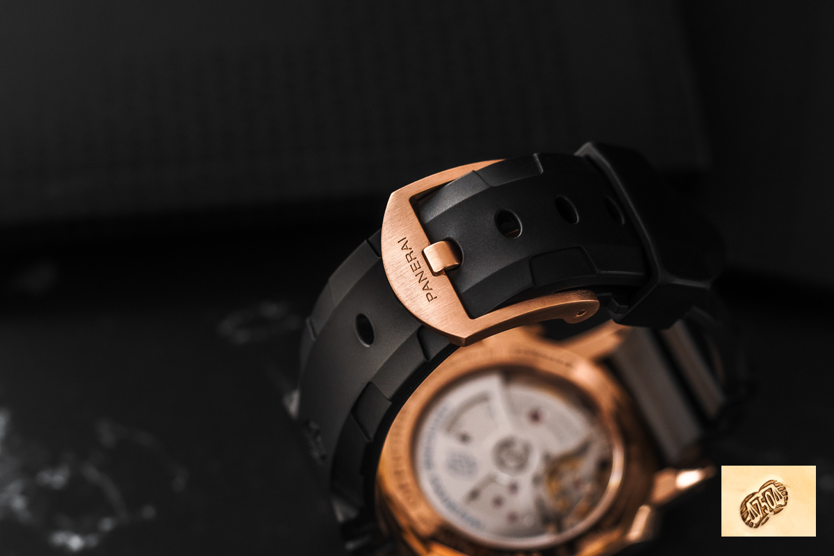 oryginalny Panerai. Wykonany z kauczuku. Zapinany oryginalnym, złotym zapięciem klamerkowym Panerai.