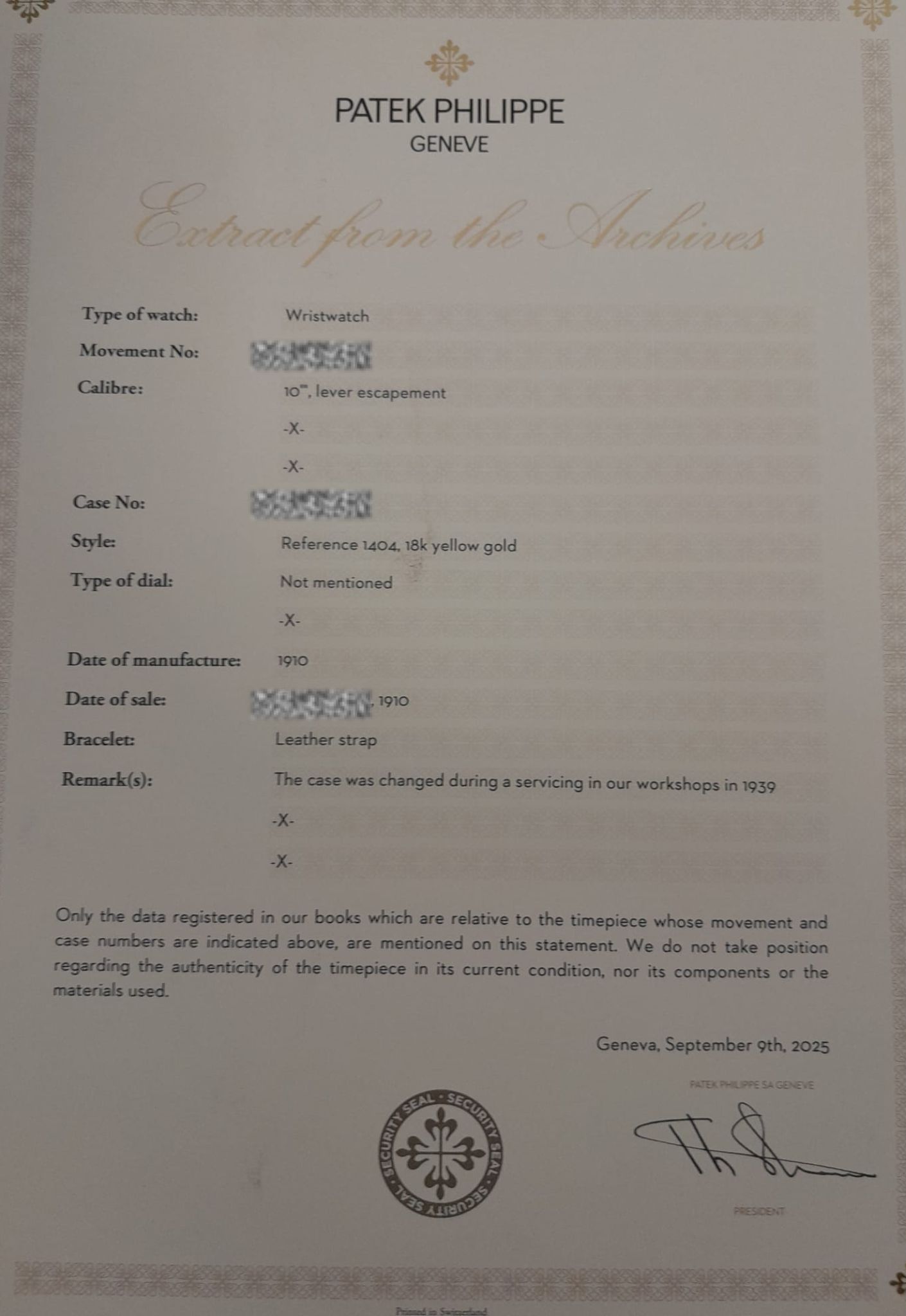 Zegarek w zestawie z oryginalnym etui Patek Philippe oraz wyciągiem z archiwum/certyfikatem oryginalności Patek Philippe