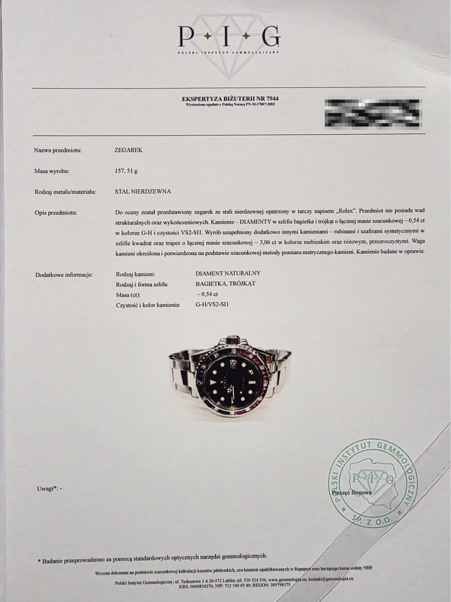Zegarek w komplecie z oryginalnym etui ROLEX oraz Certyfikat Polskiego Instytutu Gemmologicznego