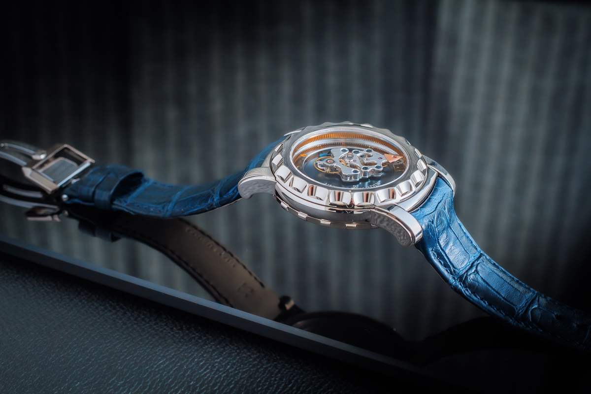 Aktualny czas w zegarku pokazują wskazówki, będące również integralną częścią mechanizmu dzięki czemu tworzą niesamowite zjawisko wizualne. Czasomierz pozbawiony jest klasycznej koronki, a aktualną godzinę ustawia się za pomocą specjalnie dostosowanego pierścienia lunety. Szalone w tym zegarku jest również nakręcanie. By czasomierz rozpoczął swój chód należy nakręcić sprężynę, za pomocą specjalnie skonstruowanego obrotowego dekla.