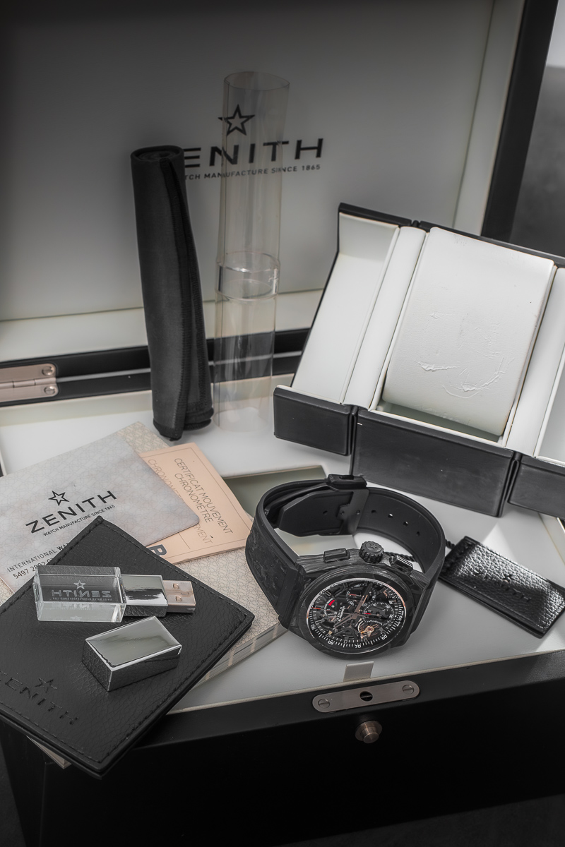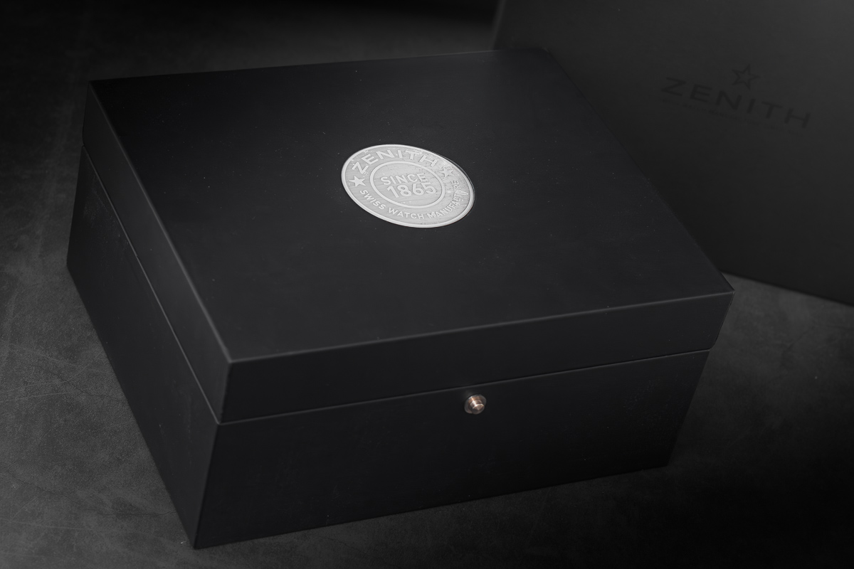 Zegarek w komplecie z oryginalnym etui ZENITH, dokumentami Zenith oraz dodatkowym paskiem Zenith